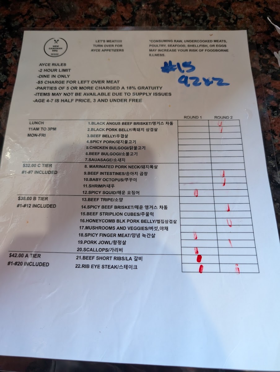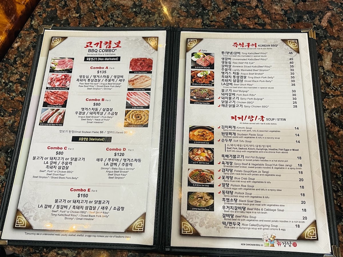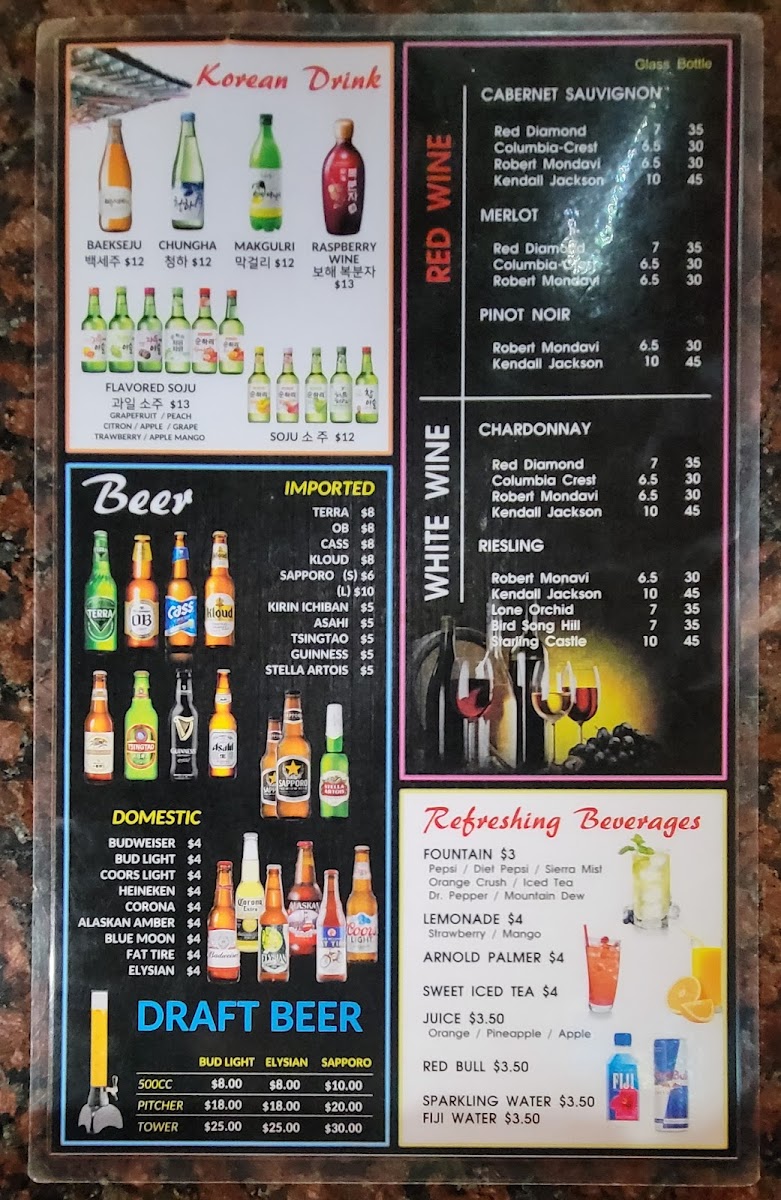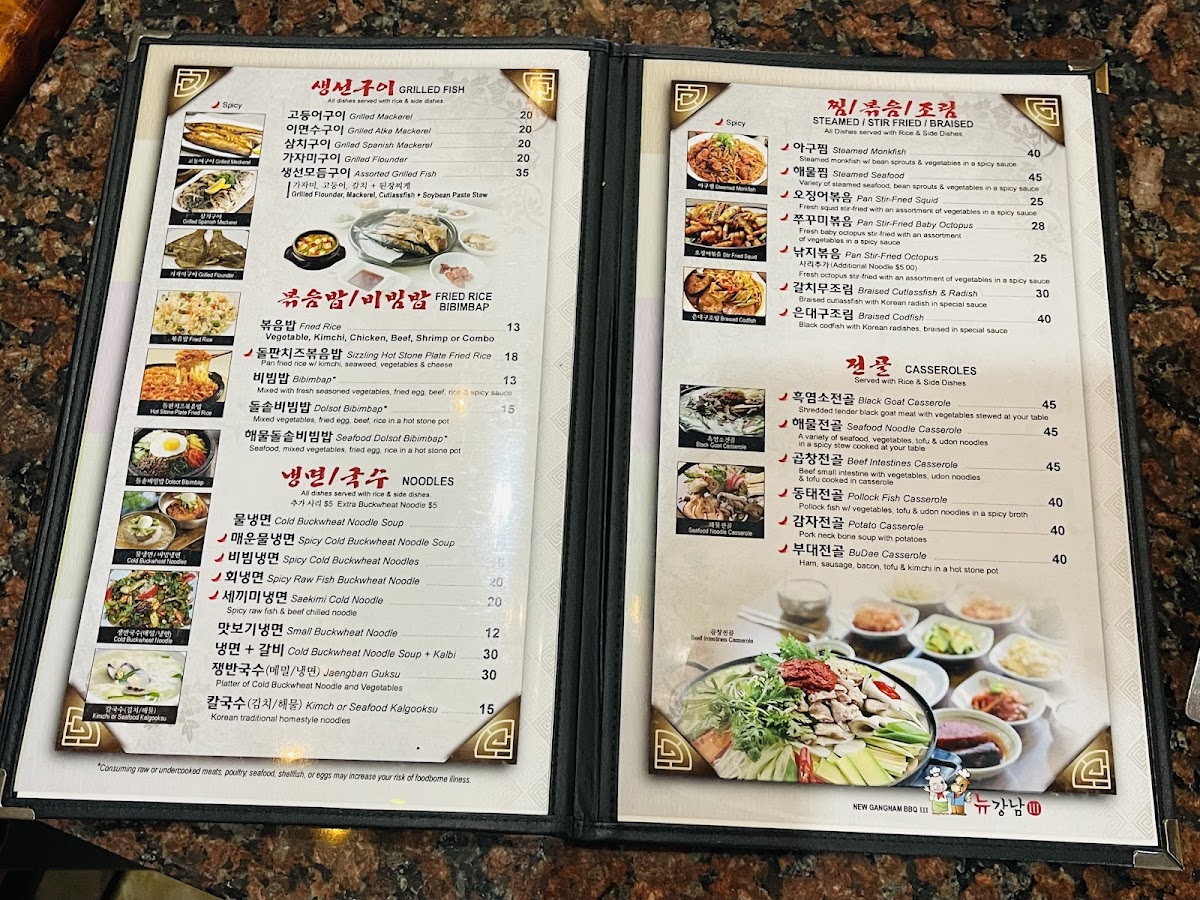 Doenjang-seasoned stew made with beef broth, beef, various seafood, and squash. The broth is thick and flavorful and good for mixing with rice.